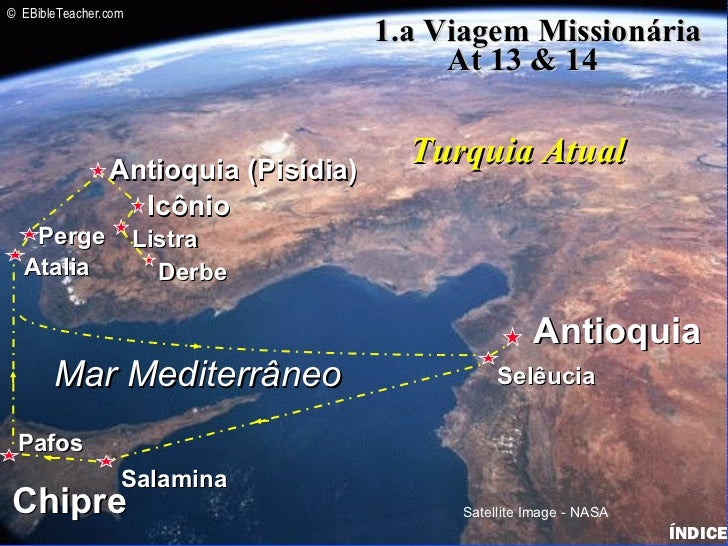 35. 35. © EBibleTeacher.com 1.a Viagem Missionária At 13 & 14 Paul-1st Missionary Journey Antioquia (Pisídia) Turquia Atual Icônio Perge Listra Atalia Derbe Antioquia Mar Mediterrâneo Selêucia Pafos SalaminaChipre Satellite Image - NASA ÍNDICE