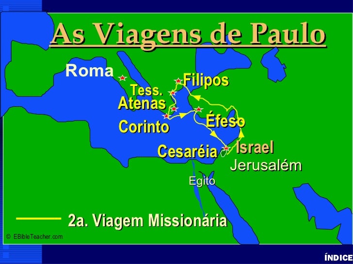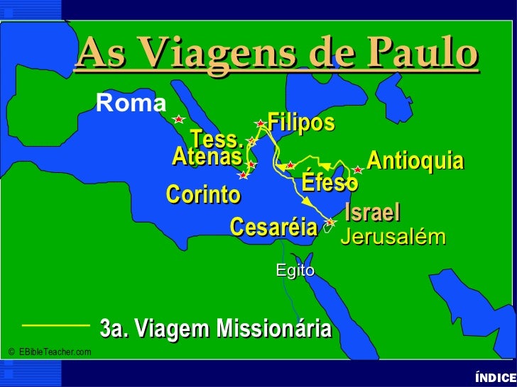 37. 37. As Viagens de Paulo Paul’s 3rd Journey Paul-3rd Missionary Journey Roma • Click to add text Filipos Tess. Atenas Antioquia Corinto Éfeso Israel Cesaréia Jerusalém Egito 3a. Viagem Missionária© EBibleTeacher.com ÍNDICE