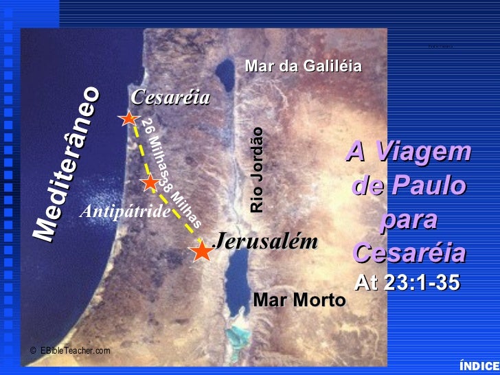 38. 38. Paul to Caesarea Mar da Galiléia Cesaréia neo 26 M Rio Jordão A Viagem ite râ ilha 3 de Paulo 8 sM ed M Antipátride para ilh as Jerusalém Cesaréia At 23:1-35 Mar Morto© EBibleTeacher.com ÍNDICE