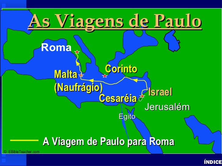 39. 39. Paul’s Journey to Rome As Viagens de Paulo Paul- Journey to Rome • Click to add text Roma Malta Corinto Israel (Naufrágio) Israel Cesaréia Jerusalém Egito A Viagem de Paulo para Roma© EBibleTeacher.com ÍNDICE