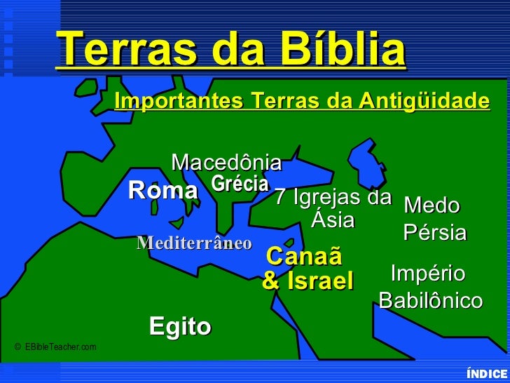 4. 4. Terras da Bíblia Important Ancient Lands Importantes Terras da Antigüidade Macedônia Roma Grécia 7 Igrejas da Medo Ásia Mediterrâneo Pérsia Canaã & Israel Império Babilônico Egito© EBibleTeacher.com ÍNDICE
