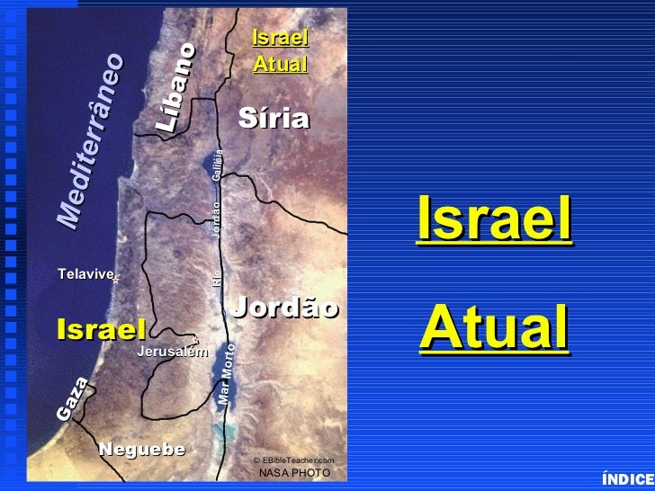 42. 42. Israel no Atual Modern Israel ân eo Líba Síria iterr GaliléiaMed Jordão Israel Telavive Rio Jordão Israel Jerusalém Atual to Mar Mor zaGa Neguebe © EBibleTeacher.com NASA PHOTO ÍNDICE