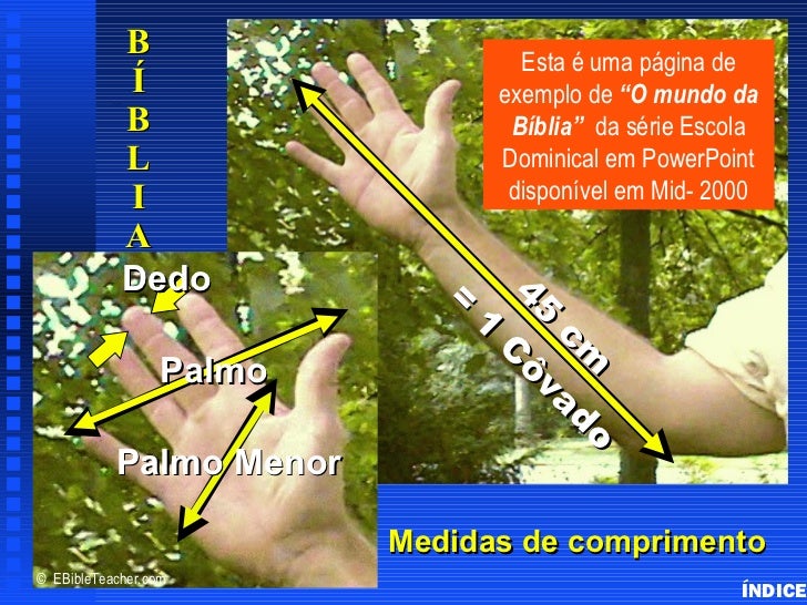 50. 50. B Esta é uma página de Í exemplo de “O mundo da B Cubit Diagram Sample Bíblia” da série Escola L Dominical em PowerPoint I disponível em Mid- 2000 A Dedo 45 Cô 45 ô = = 1 1 cm d cm d Palmo C va va o o Palmo Menor s Medidas de comprimento© EBibleTeacher.com ÍNDICE