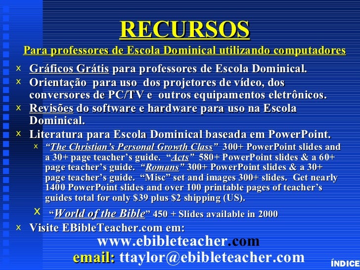 51. 51. RECURSOS Para professores de Escola Dominical utilizando computadoresx Gráficos Grátis para professores de Escola Dominical.x Orientação para uso dos projetores de vídeo, dos conversores de PC/TV e outros equipamentos eletrônicos.x Revisões do software e hardware para uso na Escola Dominical.x Literatura para Escola Dominical baseada em PowerPoint. x “The Christian’s Personal Growth Class” 300+ PowerPoint slides and a 30+ page teacher’s guide. “Acts” 580+ PowerPoint slides & a 60+ page teacher’s guide. “Romans” 300+ PowerPoint slides & a 30+ page teacher’s guide. “Misc” set and images 300+ slides. Get nearly 1400 PowerPoint slides and over 100 printable pages of teacher’s guides total for only $39 plus $2 shipping (US). x “World of the Bible” 450 + Slides available in 2000x Visite EBibleTeacher.com em: www.ebibleteacher.com email: ttaylor@ebibleteacher.com ÍNDICE