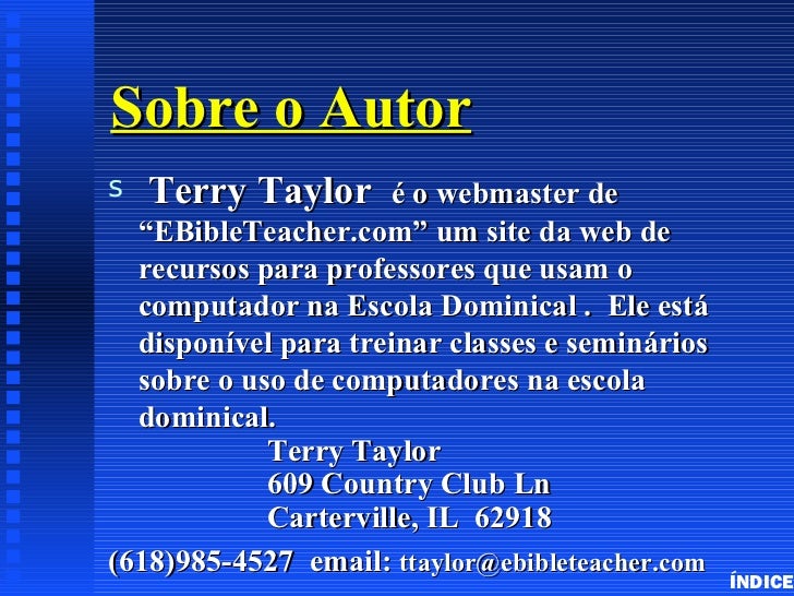 Sobre o Autors   Terry Taylor      é o webmaster de  “EBibleTeacher.com” um site da web de  recursos para professores que ...