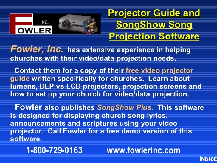 53. 53. Projector Guide and SongShow Song Projection SoftwareFowler, Inc. has extensive experience in helpingchurches with their video/data projection needs. Contact them for a copy of their free video projectorguide written specifically for churches. Learn aboutlumens, DLP vs LCD projectors, projection screens andhow to set up your church for video/data projection. Fowler also publishes SongShow Plus. This softwareis designed for displaying church song lyrics,announcements and scriptures using your videoprojector. Call Fowler for a free demo version of thissoftware. 1-800-729-0163 www.fowlerinc.com ÍNDICE