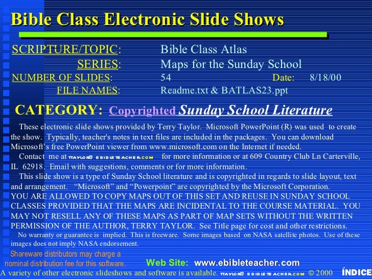 54. 54. Bible Class Electronic Slide Shows SCRIPTURE/TOPIC: Copyright & Business Info Copyright & Business Info Bible Class Atlas SERIES: Maps for the Sunday School NUMBER OF SLIDES: 54 Date: 8/18/00 FILE NAMES: Readme.txt & BATLAS23.ppt CATEGORY: Copyrighted Sunday School Literature These electronic slide shows provided by Terry Taylor. Microsoft PowerPoint (R) was used to create the show. Typically, teachers notes in text files are included in the packages. You can download Microsoft’s free PowerPoint viewer from www.microsoft.com on the Internet if needed. Contact me at ttaylor@ e b ib le te ach e r.com for more information or at 609 Country Club Ln Carterville, IL 62918. Email with suggestions, comments or for more information. This slide show is a type of Sunday School literature and is copyrighted in regards to slide layout, text and arrangement. “Microsoft” and “Powerpoint” are copyrighted by the Microsoft Corporation. YOU ARE ALLOWED TO COPY MAPS OUT OF THIS SET AND REUSE IN SUNDAY SCHOOL CLASSES PROVIDED THAT THE MAPS ARE INCIDENTAL TO THE COURSE MATERIAL. YOU MAY NOT RESELL ANY OF THESE MAPS AS PART OF MAP SETS WITHOUT THE WRITTEN PERMISSION OF THE AUTHOR, TERRY TAYLOR. See Title page for cost and other restrictions. No warranty or guarantee is implied. This is freeware. Some images based on NASA satellite photos. Use of these images does not imply NASA endorsement. Shareware distributors may charge a nominal distribution fee for this software. Web Site: www.ebibleteacher.comA variety of other electronic slideshows and software is available. ttaylor@ e b ib le te ach e r.com © 2000 ÍNDICE