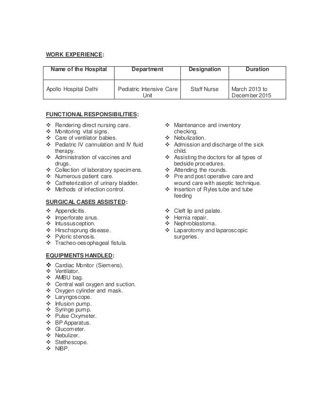 2. 2. WORK EXPERIENCE: Name of the Hospital Department Designation Duration Apollo Hospital Delhi Pediatric Intensive Care Unit Staff Nurse March 2013 to December 2015 FUNCTIONAL RESPONSIBILITIES:  Rendering direct nursing care.  Monitoring vital signs.  Care of ventilator babies.  Pediatric IV cannulation and IV fluid therapy.  Administration of vaccines and drugs.  Collection of laboratory specimens.  Numerous patient care.  Catheterization of urinary bladder.  Methods of infection control.  Maintenance and inventory checking.  Nebulization.  Admission and discharge of the sick child.  Assisting the doctors for all types of bedside procedures.  Attending the rounds.  Pre and post operative care and wound care with aseptic technique.  Insertion of Ryles tube and tube feeding SURGICAL CASES ASSISTED:  Appendicitis.  Imperforate anus.  Intussusception.  Hirschsprung disease.  Pyloric stenosis.  Tracheo-oesophageal fistula.  Cleft lip and palate.  Hernia repair.  Nephroblastoma.  Laparotomy and laparoscopic surgeries. EQUIPMENTS HANDLED:  Cardiac Monitor (Siemens).  Ventilator.  AMBU bag.  Central wall oxygen and suction.  Oxygen cylinder and mask.  Laryngoscope.  Infusion pump.  Syringe pump.  Pulse Oxymeter.  BP Apparatus.  Glucometer.  Nebulizer.  Stethescope.  NIBP.