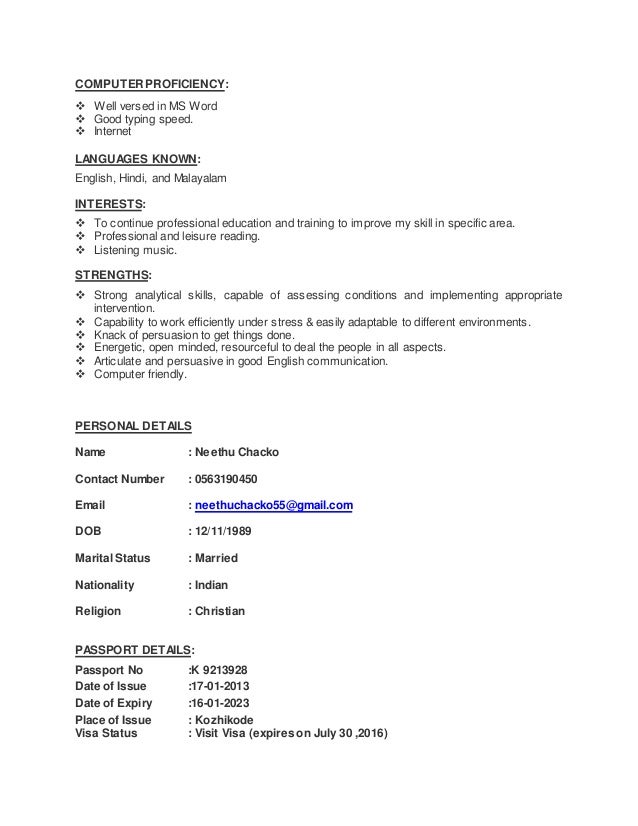 3. 3. COMPUTER PROFICIENCY:  Well versed in MS Word  Good typing speed.  Internet LANGUAGES KNOWN: English, Hindi, and Malayalam INTERESTS:  To continue professional education and training to improve my skill in specific area.  Professional and leisure reading.  Listening music. STRENGTHS:  Strong analytical skills, capable of assessing conditions and implementing appropriate intervention.  Capability to work efficiently under stress & easily adaptable to different environments.  Knack of persuasion to get things done.  Energetic, open minded, resourceful to deal the people in all aspects.  Articulate and persuasive in good English communication.  Computer friendly. PERSONAL DETAILS Name : Neethu Chacko Contact Number : 0563190450 Email : neethuchacko55@gmail.com DOB : 12/11/1989 Marital Status : Married Nationality : Indian Religion : Christian PASSPORT DETAILS: Passport No :K 9213928 Date of Issue :17-01-2013 Date of Expiry :16-01-2023 Place of Issue : Kozhikode Visa Status : Visit Visa (expires on July 30 ,2016)