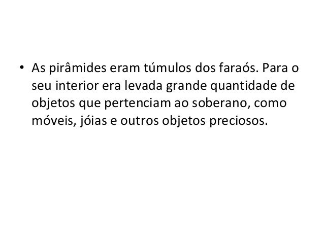 6. 6. • As pirâmides eram túmulos dos faraós. Para o seu interior era levada grande quantidade de objetos que pertenciam ao soberano, como móveis, jóias e outros objetos preciosos.