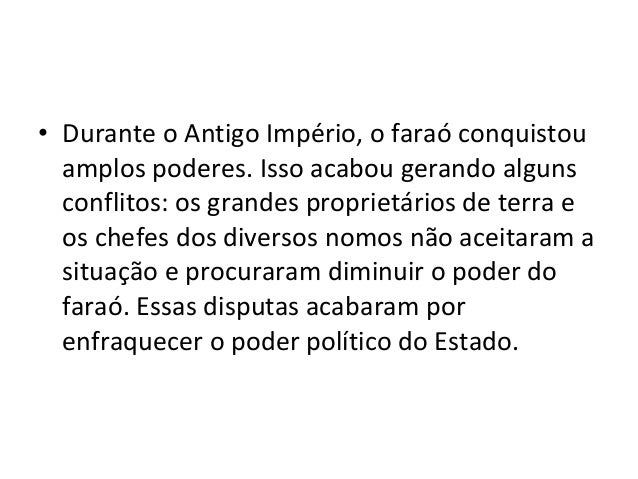 7. 7. • Durante o Antigo Império, o faraó conquistou amplos poderes. Isso acabou gerando alguns conflitos: os grandes proprietários de terra e os chefes dos diversos nomos não aceitaram a situação e procuraram diminuir o poder do faraó. Essas disputas acabaram por enfraquecer o poder político do Estado.