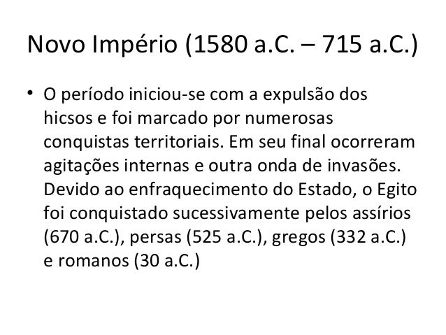13. 13. Novo Império (1580 a.C. – 715 a.C.) • O período iniciou-se com a expulsão dos hicsos e foi marcado por numerosas conquistas territoriais. Em seu final ocorreram agitações internas e outra onda de invasões. Devido ao enfraquecimento do Estado, o Egito foi conquistado sucessivamente pelos assírios (670 a.C.), persas (525 a.C.), gregos (332 a.C.) e romanos (30 a.C.)