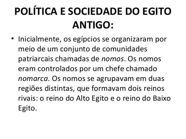 14. 14. POLÍTICA E SOCIEDADE DO EGITO ANTIGO: • Inicialmente, os egípcios se organizaram por meio de um conjunto de comunidades patriarcais chamadas de nomos. Os nomos eram controlados por um chefe chamado nomarca. Os nomos se agrupavam em duas regiões distintas, que formavam dois reinos rivais: o reino do Alto Egito e o reino do Baixo Egito.