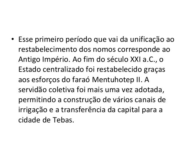 20. 20. • Esse primeiro período que vai da unificação ao restabelecimento dos nomos corresponde ao Antigo Império. Ao fim do século XXI a.C., o Estado centralizado foi restabelecido graças aos esforços do faraó Mentuhotep II. A servidão coletiva foi mais uma vez adotada, permitindo a construção de vários canais de irrigação e a transferência da capital para a cidade de Tebas.