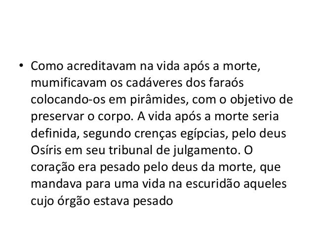 33. 33. • Como acreditavam na vida após a morte, mumificavam os cadáveres dos faraós colocando-os em pirâmides, com o objetivo de preservar o corpo. A vida após a morte seria definida, segundo crenças egípcias, pelo deus Osíris em seu tribunal de julgamento. O coração era pesado pelo deus da morte, que mandava para uma vida na escuridão aqueles cujo órgão estava pesado