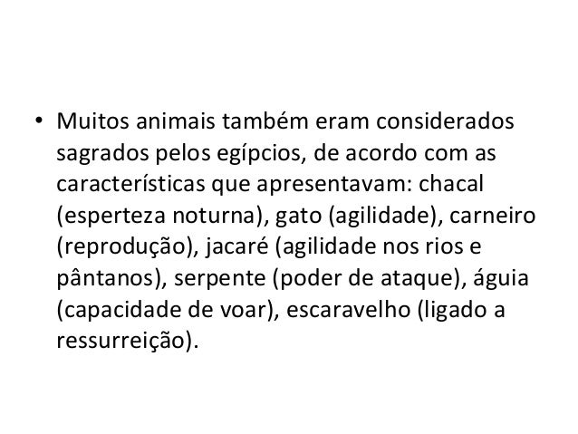 35. 35. • Muitos animais também eram considerados sagrados pelos egípcios, de acordo com as características que apresentavam: chacal (esperteza noturna), gato (agilidade), carneiro (reprodução), jacaré (agilidade nos rios e pântanos), serpente (poder de ataque), águia (capacidade de voar), escaravelho (ligado a ressurreição).