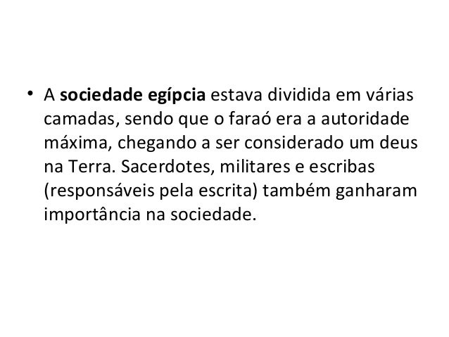 48. 48. • A sociedade egípcia estava dividida em várias camadas, sendo que o faraó era a autoridade máxima, chegando a ser considerado um deus na Terra. Sacerdotes, militares e escribas (responsáveis pela escrita) também ganharam importância na sociedade.
