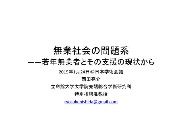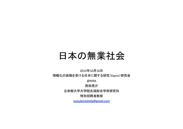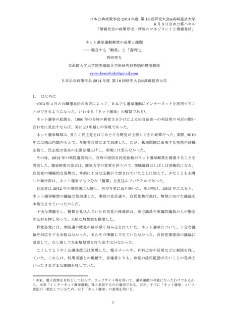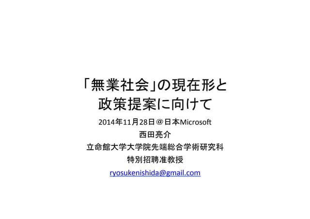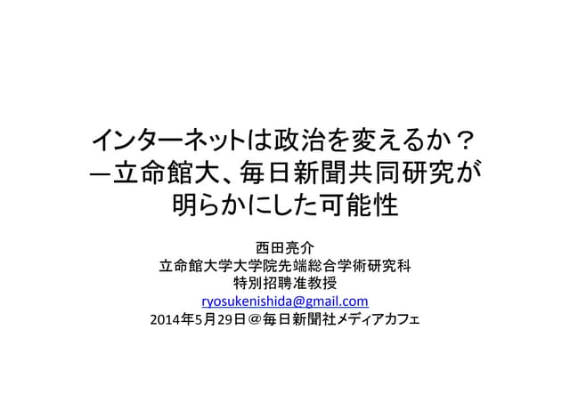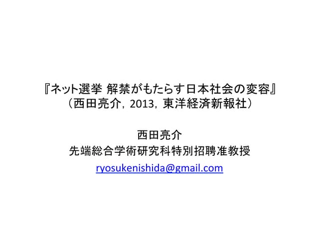 2. 2. 自己紹介 • 東京工業大学大学マネジメントセンター准教授。博士(政策・メディア)。 • 専門は社会学、公共政策学、情報社会論、ジャーナリズム研究。情報化と社会変容、情報と 政治(ネット選挙)、社会起業家の企業家精神醸成過程や政策としての「新しい公共」、地域 産業振興等を研究。 • 1983年京都生まれ。慶應義塾大学総合政策学部卒業。同大学院政策・メディア研究科修士 課程修了。同大学院政策・メディア研究科後期博士課程単位取得退学。2014年に慶應義塾 大学にて、博士(政策・メディア)取得。同大学院政策・メディア研究科助教(有期・研究奨励 Ⅱ)、(独)中小機構経営支援情報センターリサーチャー、東洋大学、学習院大学、デジタル ハリウッド大学大学院非常勤講師、立命館大大学院特別招聘准教授等を経て2015年9月よ り現職。 • 単著に『メディアと自民党』(角川書店)、『ネット選挙 解禁がもたらす日本社会の変容』(東洋 経済新報社)、「ネット選挙とデジタル・デモクラシー」(NHK出版)。 • (共)編著・共著に『民主主義 〈一九四八-­‐五三〉中学・高校社会科教科書エッセンス復刻版』 (幻冬舎)、『無業社会 働くことができない若者たちの未来』(朝日新聞出版)、『「統治」を創 造する』(春秋社)『大震災後の社会学』(講談社)ほか。 • NHK「日曜討論」「クローズアップ現代」Tokyo   MX「モーニングクロス」等メディア出演多数。JFN 各局月曜AM5:30〜「Ride   On  the  Politics」パーソナリティ。 2