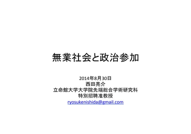 3. 3. • 近刊(1月29日発売)『民主主義 〈一九四八-­‐五三〉中学・高校社会科教科書 エッセンス復刻版』(2016年,幻冬舎) • 『メディアと自民党』(2015年,角川書店) • 『無業社会 働くことができない若者たちの未来』(2014年,朝日新聞出版) • 『ネット選挙 解禁がもたらす日本社会の変容』(2013年,東洋経済新報社) • 『ネット選挙とデジタル・デモクラシー』(2013年,NHK出版) • 毎日新聞社ネット選挙報道 (2013年参院選、2014年東京都知事選、2014年衆院選) • 問題意識: • 与件としての「新自由主義」のもとで、「寛容な社会」を擁護する論理と政策は、いかに して可能か • 社会政策と政治参加の同時再検討 3