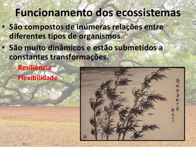 14. 14. Funcionamento dos ecossistemas • São compostos de inúmeras relações entre diferentes tipos de organismos. • São muito dinâmicos e estão submetidos a constantes transformações. – Resiliência – Flexibilidade