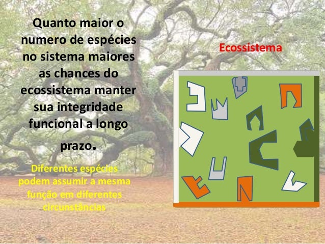 15. 15. Quanto maior o numero de espécies no sistema maiores as chances do ecossistema manter sua integridade funcional a longo prazo. Diferentes espécies podem assumir a mesma função em diferentes circunstâncias Ecossistema