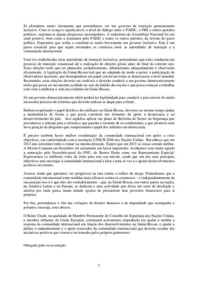 2. 2. Já afirmámos muito claramente que pretendemos ver um governo de transição genuinamenteinclusivo. Com os avanços significativos a nível do diálogo entre o PAIGC, o PRS e outros partidospolíticos, registam-se alguns progressos encorajadores. A reabertura da Assembleia Nacional foi umsinal positivo, bem como a assinatura pelo PAIGC e todos os outros partidos, da revisão do pactopolítico. Esperamos que venha a constituir-se muito brevemente um governo inclusivo. Este é umpasso essencial para que sejam retomados os contactos entre as autoridades de transição e acomunidade internacional.Uma vez estabelecidas estas autoridades de transição inclusivas, pretendemos que estas conduzam umprocesso de transição consensual até à realização de eleições gerais antes do final do corrente ano.Estas eleições terão que ser planeadas cuidadosamente, administradas adequadamente e observadaseficazmente. A legislação da Guiné-Bissau terá que ser adaptada de modo a prever a participação deobservadores nacionais, que desempenham um papel crucial em todas as democracias a nível mundial.Resumindo, estas eleições deverão ser credíveis e deverão conduzir a um governo democraticamenteeleito que possa ser novamente acolhido no seio da família das nações e que possa começar a trabalharcom vista a melhorar a vida dos cidadãos da Guiné-Bissau.Só um governo democraticamente eleito poderá ter legitimidade para conduzir o país através do muitonecessário processo de reformas que deverão realizar-se daqui para a frente.Embora respeitando o papel histórico dos militares na Guiné-Bissau, devemos ao mesmo tempo ajudara modernizá-lo de forma a que possa constituir um elemento de apoio à democracia e aodesenvolvimento do país. Isso significa aplicar um plano de Reforma do Sector da Segurança queprovidencie a retirada para a reforma e que garanta o sustento de ex-combatentes, e que promova umanova geração de dirigentes que compreendam o papel dos militares em democracia.É preciso também haver melhor coordenação da comunidade internacional em apoio a estesobjectivos, em conformidade com a resolução UNSCR 2048 das Nações Unidas. Reconheço que em2012 não estivemos todos a rumar na mesma direcção. Espero que em 2013 as coisas corram melhor.A Missão Conjunta em Dezembro foi certamente um factor importante. Acolhemos com muito agradoa nomeação pelo Secretário-geral da ONU, de Ramos Horta como seu Representante Especial.Expressamos os melhores votos de êxito para esta sua missão, sendo que um dos seus principaisobjectivos será encorajar a comunidade internacional a falar a uma só voz e a apoiar desenvolvimentospositivos no terreno.Acresce ainda que queremos ver progressos na luta contra o tráfico de droga. Pretendemos que acomunidade internacional tome medidas mais eficazes contra os criminosos – e independentemente dasua posição isso é o que eles são verdadeiramente – que, na Guiné-Bissau, em outros países na região,na América Latina e na Europa, se dedicam a uma actividade que deixa um rasto de desolação emiséria por onde passa, numa atitude egoísta de procurarem tirar proveitos financeiros para sipróprios.Por fim, pretendemos o fim das violações de direitos humanos e da impunidade que acompanha eportanto, encoraja, estes abusos.O Reino Unido, na qualidade de Membro Permanente do Conselho de Segurança das Nações Unidas,e membro influente da União Europeia, continuará activamente empenhado em ajudar a moldar aresposta da comunidade internacional em função dos desenvolvimentos na Guiné-Bissau, e ajudar adefinir o empenhamento e o apoio renovados da comunidade internacional que deverão resultar dasiniciativas positivas que vierem a ser tomadas pelos próprios guineenses.Obrigado pela vossa atenção. 2