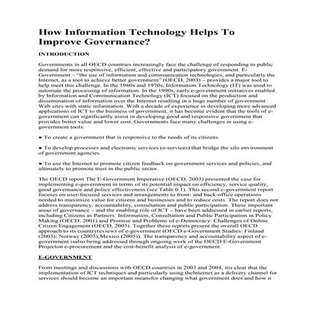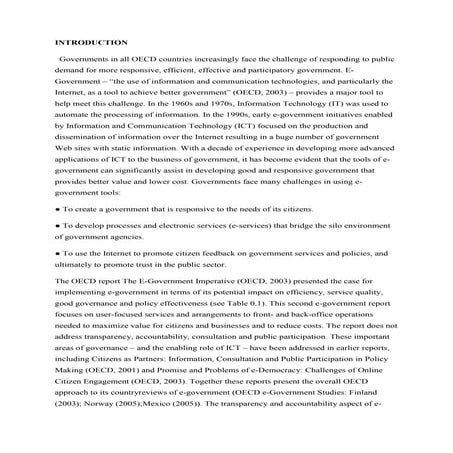 3. 3. 2 This document presents the Recommendation on Digital Government Strategies aimed at bringing governments closer to citizens and businesses. It was developed by the Public Governance Committee (PGC). The steady integration of new technologies (e.g. cloud computing, social media, mobile technology) into the everyday lives of people, businesses and governments is helping to open up governments and giving rise to new forms of public engagement and relationships that transcend public, private and social spheres. This new digital environment offers opportunities for more collaborative and participatory relationships that allow relevant stakeholders (i.e. citizens, business and non-governmental organisations), to actively shape political priorities, collaborate in the design of public services and participate in their delivery to provide more coherent and integrated solutions to complex challenges. Digitally enabled participation and production of services is changing people’s expectations about their relationships with governments. As a result, new public governance approaches are needed to support a shift from governments anticipating citizens’ and business’s needs (citizen-centric approaches) to citizens and businesses determining their own needs and addressing them in partnership with governments (citizen-driven approaches). The diffusion and adoption of technologies is also changing expectations on governments’ ability to deliver public value. Governments can no longer afford to separate efficiency from other societal policy objectives in the governing and managing of digital technologies. The economic and financial crisis is showing that improved service delivery and internal public sector efficiency go hand-in-hand with economic growth, societal equality, and good governance objectives such as greater transparency, integrity and citizen engagement. This new digital governance context and the multiplication of technological options raise challenges and risks for which governments must prepare. The new possibilities, and the changing societal expectations that arise from them, require governments to re-examine their governance approaches and strategies. Failures to do so could mean an accelerated loss of trust in government and a perception that it is out of touch with societal and technological trends. But are governments really equipped to use digital technology to work more closely with citizens and businesses, particularly in a context of continuous budgetary constraints? The challenge is not to introduce digital technologies into public administrations; it is to integrate their use into public sector modernisation efforts. Public sector capacities, workflows, business processes, operations, methodologies and frameworks need to be adapted to the rapidly evolving dynamics and relations between the stakeholders that are already enabled – and in many instances empowered – by the digital environment. Setting up more open approaches to policymaking and public service delivery requires governments to re-organise themselves around user expectations, needs and associated requirements, rather than their own internal logic and needs. To this end, digital government strategies need to become firmly embedded in mainstream modernisation policies and service design so that the relevant stakeholders outside of government are included and feel ownership for the final outcomes of major policy reforms. This shift to use technology to shape public governance outcomes, and not simply to support government processes, requires coherent and strategic planning of policies for digital technologies use in all areas and at all levels of the administration. However, governments remain organised around units, each with clear responsibilities and processes, as well as problems to integrate their ways of working. This is a major challenge to creating broad political commitment and ownership for integration of digital government into overall public sector reform strategies. Governments need to ensure that their own capacities, norms, structures and risk management models are aligned with their strategic digital government vision, and vice- versa. It is imperative that governments also understand the level of organisational maturity of the public sector in relation to project management methods and approaches, and are able to achieve appropriate levels of maturity in relation to their needs and ambitions, to optimise the impact and results of digital government investments.