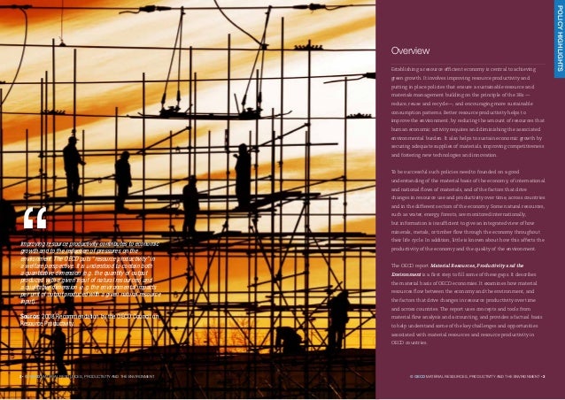 Establishing a resource efficient economy is central to achieving green growth. It involves improving resource productivity and putting in place policies that ensure a sustainable resource and materials management building on the principle of the 3Rs — reduce, reuse and recycle, and encouraging more sustainable consumption patterns.