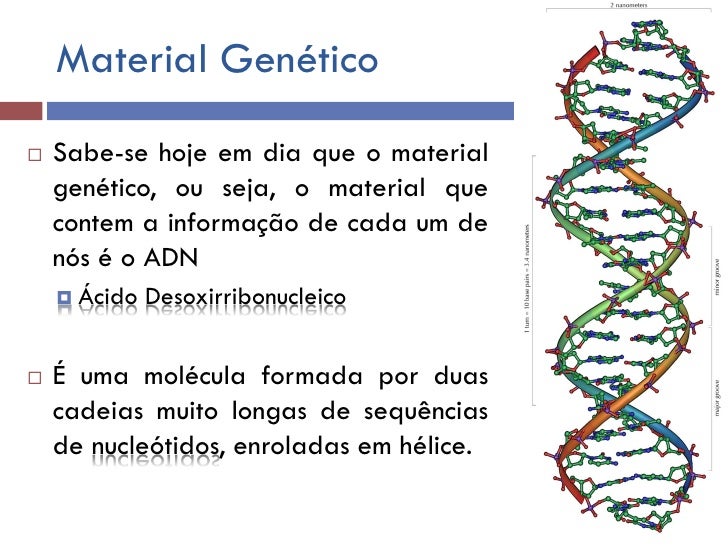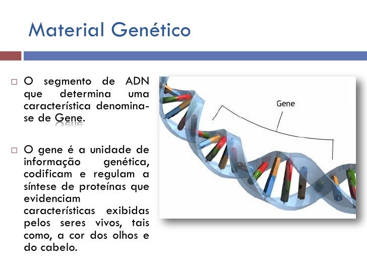 9. 9. Material Genético O segmento de ADN que determina uma característica denomina- se de Gene. O gene é a unidade de informação genética, codificam e regulam a síntese de proteínas que evidenciam características exibidas pelos seres vivos, tais como, a cor dos olhos e do cabelo.
