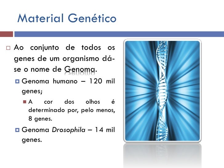 10. 10. Material Genético Ao conjunto de todos os genes de um organismo dá- se o nome de Genoma.  Genoma humano – 120 mil genes; A cor dos olhos é determinado por, pelo menos, 8 genes.  Genoma Drosophila – 14 mil genes.