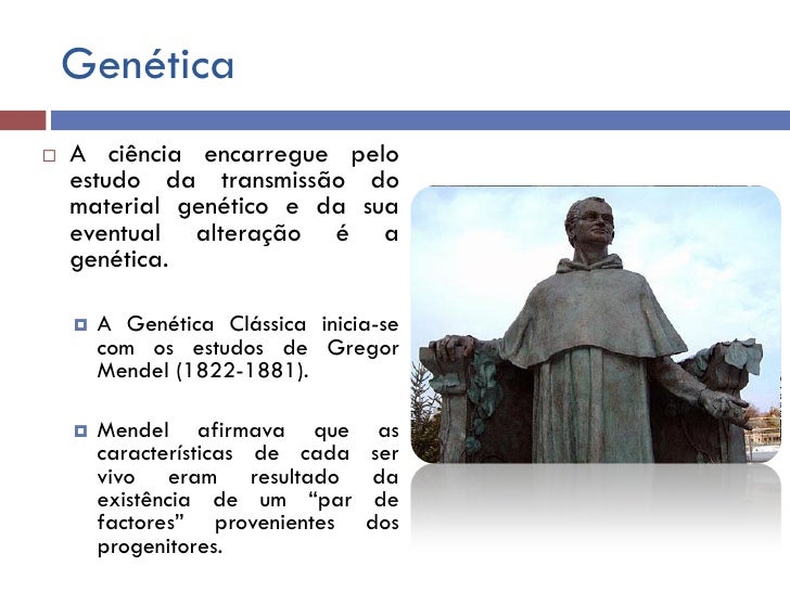 11. 11. Genética A ciência encarregue pelo estudo da transmissão do material genético e da sua eventual alteração é a genética.  A Genética Clássica inicia-se com os estudos de Gregor Mendel (1822-1881).  Mendel afirmava que as características de cada ser vivo eram resultado da existência de um “par de factores” provenientes dos progenitores.