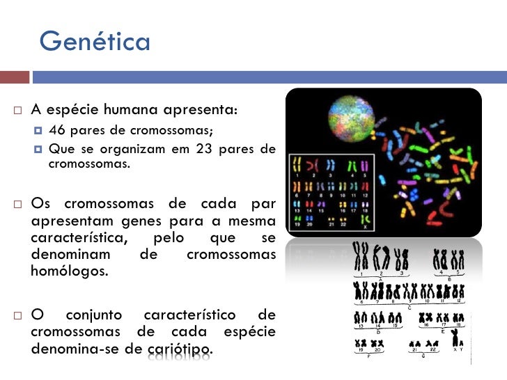 13. 13. Genética A espécie humana apresenta:  46 pares de cromossomas;  Que se organizam em 23 pares de cromossomas. Os cromossomas de cada par apresentam genes para a mesma característica, pelo que se denominam de cromossomas homólogos. O conjunto característico de cromossomas de cada espécie denomina-se de cariótipo.