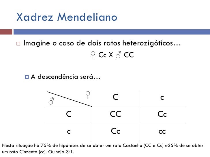 17. 17. Xadrez Mendeliano  Imagine o seguinte caso… ♀ cc X ♂ CC Rato homozigótico dominante. A descendência será… ♀ c c ♂ C Cc Cc C Cc CcNesta situação há 100% de hipóteses de se obterem ratos Castanhos (Cc).