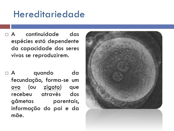 2. 2. Hereditariedade A continuidade das espécies está dependente da capacidade dos seres vivos se reproduzirem. A quando da fecundação, forma-se um ovo (ou zigoto) que recebeu através dos gâmetas parentais, informação do pai e da mãe.