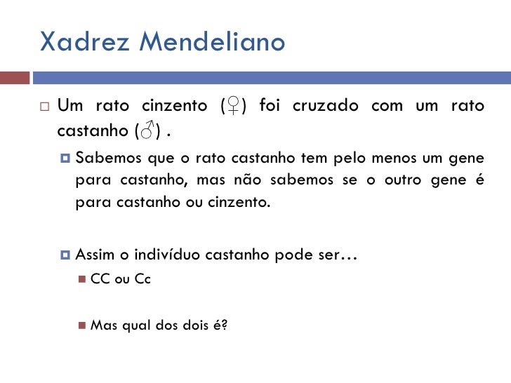 20. 20. Xadrez Mendeliano Um rato cinzento (♀) foi cruzado com um rato castanho (♂) .  Sabemos que o rato castanho tem pelo menos um gene para castanho, mas não sabemos se o outro gene é para castanho ou cinzento.  Assim o indivíduo castanho pode ser…  CC ou Cc  Mas qual dos dois é?