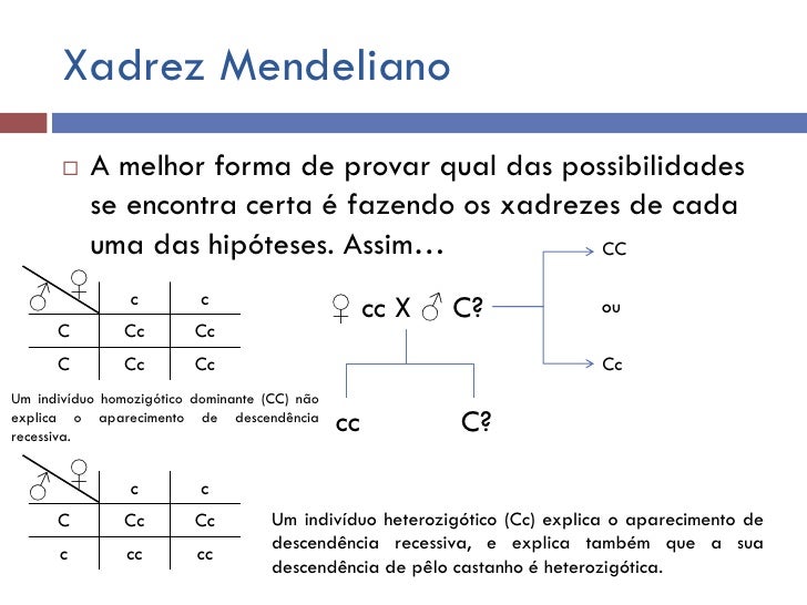 21. 21. Xadrez Mendeliano ♀ cc X ♂ C? Deste cruzamento surgiram indivíduos castanhos e cinzentos. A existência de descendência cinzenta indica que do lado parental recebe um gene recessivo, o que nos indica logo que a constituição genética do indivíduo em causa é Cc.
