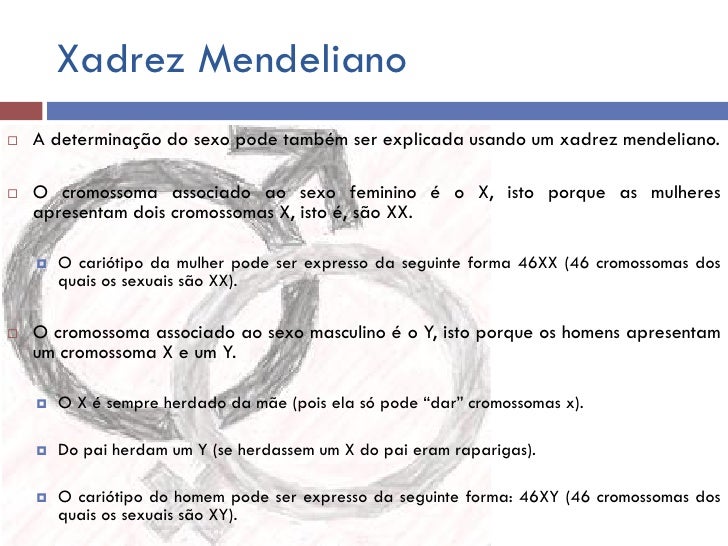 23. 23. Xadrez Mendeliano A determinação do sexo pode também ser explicada usando um xadrez mendeliano. O cromossoma associado ao sexo feminino é o X, isto porque as mulheres apresentam dois cromossomas X, isto é, são XX.  O cariótipo da mulher pode ser expresso da seguinte forma 46XX (46 cromossomas dos quais os sexuais são XX). O cromossoma associado ao sexo masculino é o Y, isto porque os homens apresentam um cromossoma X e um Y.  O X é sempre herdado da mãe (pois ela só pode “dar” cromossomas x).  Do pai herdam um Y (se herdassem um X do pai eram raparigas).  O cariótipo do homem pode ser expresso da seguinte forma: 46XY (46 cromossomas dos quais os sexuais são XY).