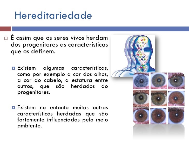 3. 3. Hereditariedade É assim que os seres vivos herdam dos progenitores as características que os definem.  Existem algumas características, como por exemplo a cor dos olhos, a cor do cabelo, a estatura entre outros, que são herdados do progenitores.  Existem no entanto muitas outras características herdadas que são fortemente influenciadas pelo meio ambiente.