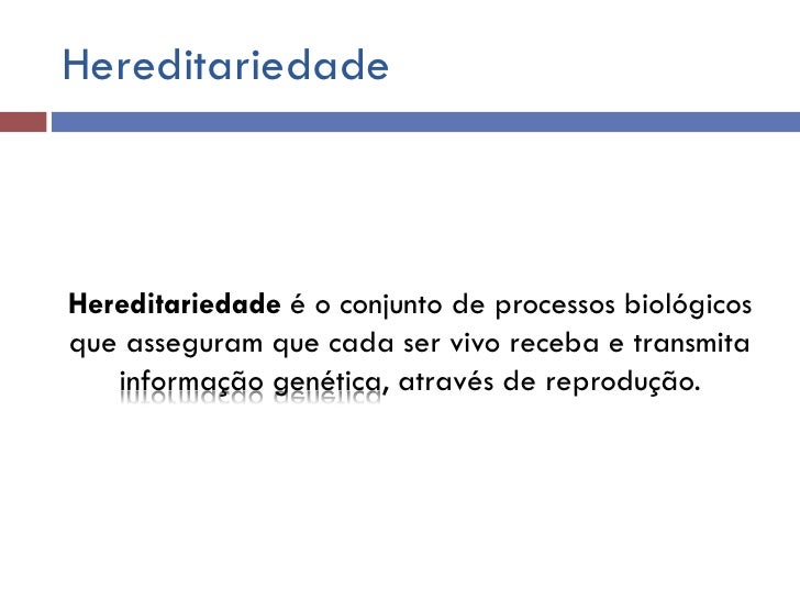 4. 4. HereditariedadeHereditariedade é o conjunto de processos biológicosque asseguram que cada ser vivo receba e transmita informação genética, através de reprodução.