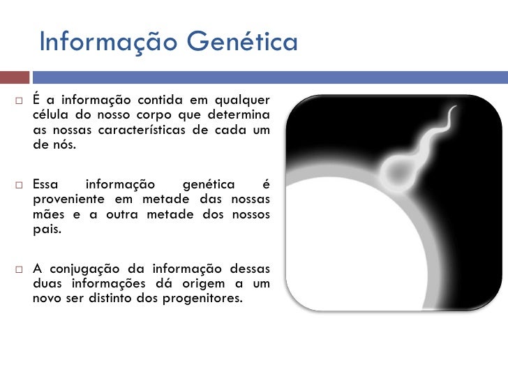 5. 5. Informação Genética É a informação contida em qualquer célula do nosso corpo que determina as nossas características de cada um de nós. Essa informação genética é proveniente em metade das nossas mães e a outra metade dos nossos pais. A conjugação da informação dessas duas informações dá origem a um novo ser distinto dos progenitores.