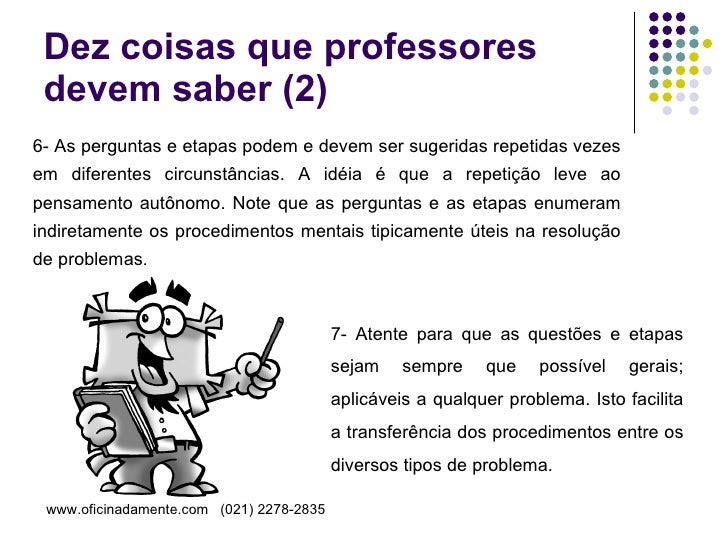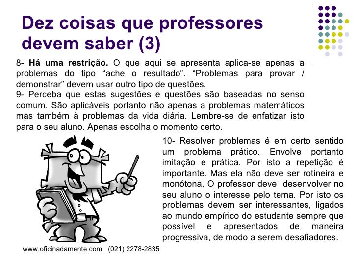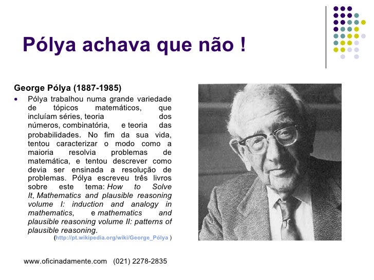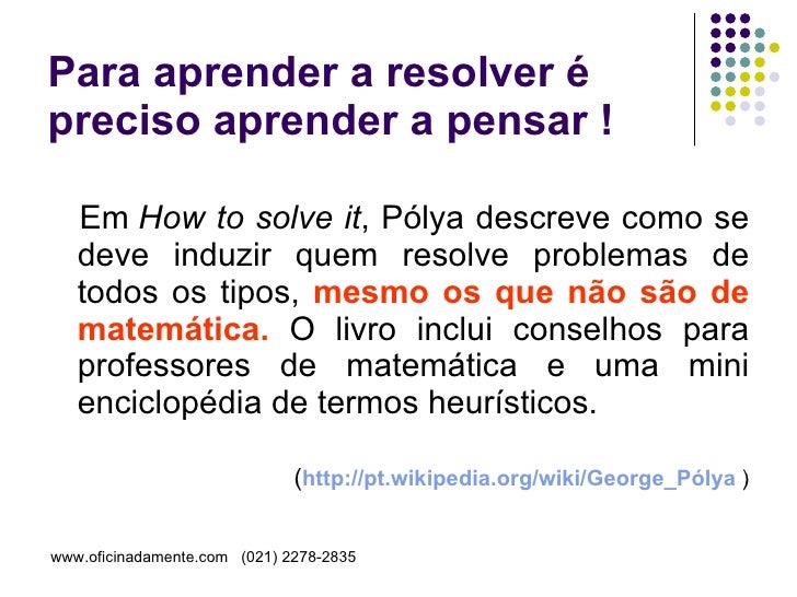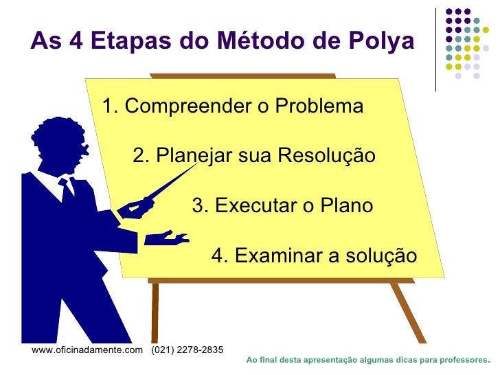Apresentação que descreve o método de Pólya para resolução de problemas matemáticos. Útil para professores e alunos.
