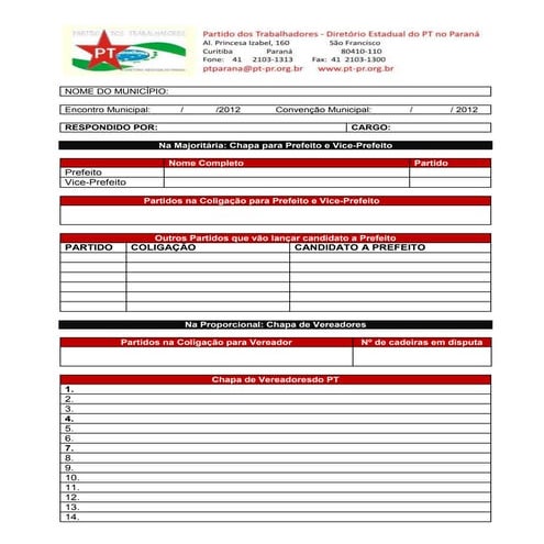 13. 13. No período eleitoral, você, candidata/o deve se preocupar o mínimo possível com problemas que surgiram durante o pleito. Para isso você deve ter uma boa equipe de coordenação de campanha. O que isso significa? Existem três perfis de coordenadores/as, os quadros (pessoas com perfil de) elaboradores, de massas e operacional. O elaborador é aquele que irá cuidar da aplicação do seu projeto na campanha, te ajudará na orientação do discurso, das e st raté g i a s e l e i to ra i s e d o mapeamento dos lugares e apoiadores. Irá tomar decisões políticas e administrativas do dia-a- dia. É um gerenciador de conflitos. O de massas deve estar em contato diariamente com a população, ir às ruas, organizar suas atividades de campanha com a população, visitar a base e estar te acompanhando na campanha. Na verdade ele é um grande mobilizador. O operacional deve resolver problemas, cuidar da prestação de contas e aplicar tudo que for de técnico referente à sua campanha, como a produção de material e os orçamentos. Muitas vezes numa campanha, por falta de recursos, você coloca seu irmão para cuidar do marketing, sua esposa como coordenadora, seu melhor amigo como tesoureiro. Pode até pode dar certo. Porém, se você quer realmente ter uma campanha vitoriosa, deve cercar-se de pessoas qualificadas. Estes, com certeza, também tem que pertencer a sua equipe. Todavia, a cientificidade e profissionalismo nas campanhas eleitorais têm sido cada vez mais utilizados, principalmente pelos candidatos mais preparados. Tarefas distribuídas, é hora de potencializar a campanha e a fazer crescer a cada dia. Vamos botar o bloco na rua e mostrar o modo petista de militar com um sorriso no rosto, daqueles de quem ama a adrenalina política e o discurso afiado. Daí para frente não há espaço vago para esperar, tudo significa conquista, até último minuto do processo eleitoral.