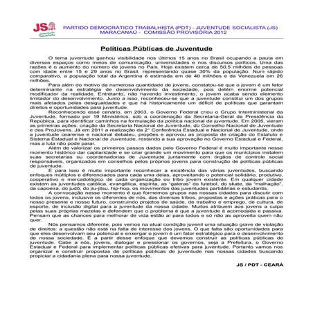5. 5. mobilizar a juventude e, a partir daí, ampliar o nosso grupo, filiar a galera. É hora de os jovens do PT começarem a alargar seus horizontes – para conduzir o partido de fato e também para ampliar o diálogo com parcelas importantes da juventude brasileira que se identificam com nosso projeto geral, mas não se reconhecem no dia-a-dia da militância partidária ou da intervenção política organizada. No 4º Congresso do Partido dos Trabalhadores, foi deliberado que todas as instâncias do partido, sejam no âmbito municipal, estadual ou nacional, obrigatoriamente terão de ter 20% de jovens em suas direções. O que isso significa? Renovação! Nosso partido está envelhecendo e é hora de fazer uma transição geracional. Nas eleições de 2012, o PT reconhece a importância dos jovens, como o ex-presidente Lula já havia pedido em 2010. É preciso institucionalizar o papel da juventude e, ao mesmo tempo, não permitir que isso se transforme num gueto. juventude, além de saber onde eles se encontram. Não adianta forçar um Um espaço onde os jovens irão definir e discurso da década de 80 ou 90 e tentar criar estratégias de como fazer uma campanha jovem. Lá serão elaboras fazer com que ele “pegue” no nosso materiais de campanha, o direcionamento segmento, a juventude merece uma do perfil do/da candidato/da para uma campanha específica, que dialogue com a campanha jovem, planejamento da nova linguagem e com um modo campanha em nosso segmento e os locais específico de comportamento. onde devemos fazer campanha visando atingir a juventude. Simples, são os jovens que sabem sobre os jovens. Conhecemos nossa forma de comunicar, de se relacionar com a