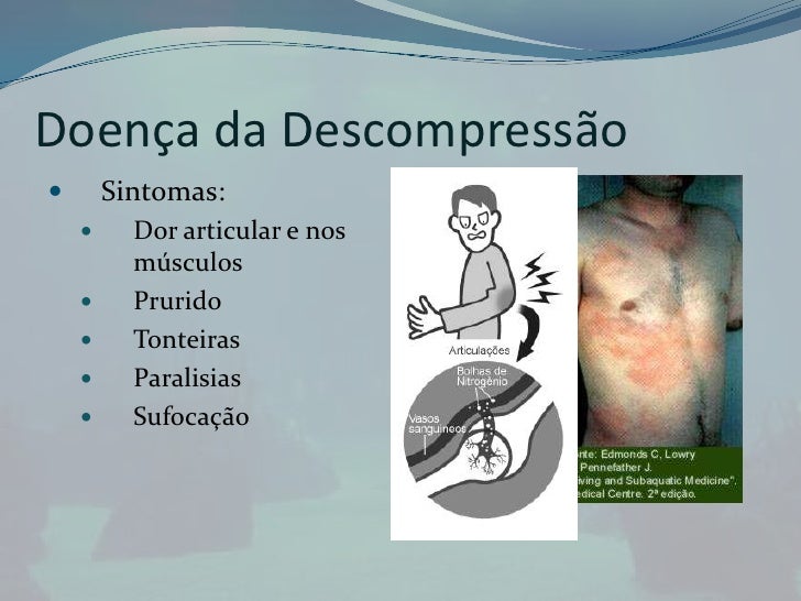 10. 10. Doença da Descompressão Sintomas:  Dor articular e nos músculos  Prurido  Tonteiras  Paralisias  Sufocação