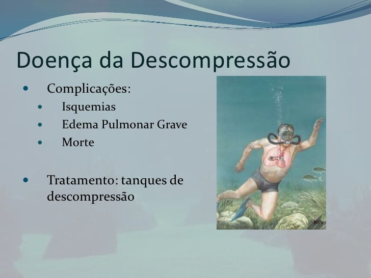 11. 11. Doença da Descompressão Complicações:  Isquemias  Edema Pulmonar Grave  Morte Tratamento: tanques de descompressão