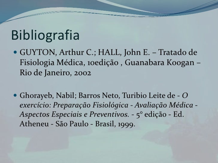 12. 12. Bibliografia GUYTON, Arthur C.; HALL, John E. – Tratado de Fisiologia Médica, 10edição , Guanabara Koogan – Rio de Janeiro, 2002 Ghorayeb, Nabil; Barros Neto, Turibio Leite de - O exercício: Preparação Fisiológica - Avaliação Médica - Aspectos Especiais e Preventivos. - 5° edição - Ed. Atheneu - São Paulo - Brasil, 1999.