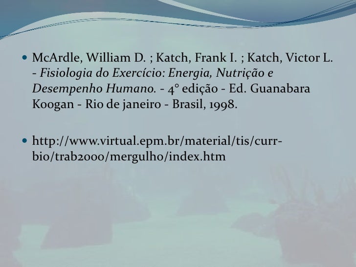 13. 13.  McArdle, William D. ; Katch, Frank I. ; Katch, Victor L. - Fisiologia do Exercício: Energia, Nutrição e Desempenho Humano. - 4° edição - Ed. Guanabara Koogan - Rio de janeiro - Brasil, 1998. http://www.virtual.epm.br/material/tis/curr- bio/trab2000/mergulho/index.htm