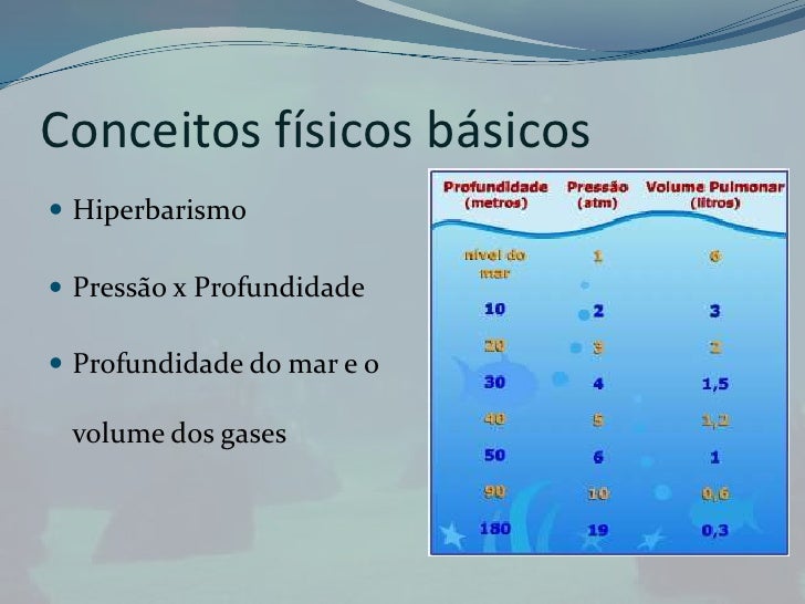 2. 2. Conceitos físicos básicos Hiperbarismo Pressão x Profundidade Profundidade do mar e o volume dos gases