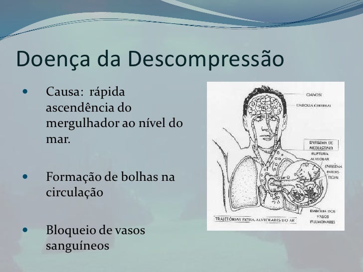 9. 9. Doença da Descompressão Causa: rápida ascendência do mergulhador ao nível do mar. Formação de bolhas na circulação Bloqueio de vasos sanguíneos