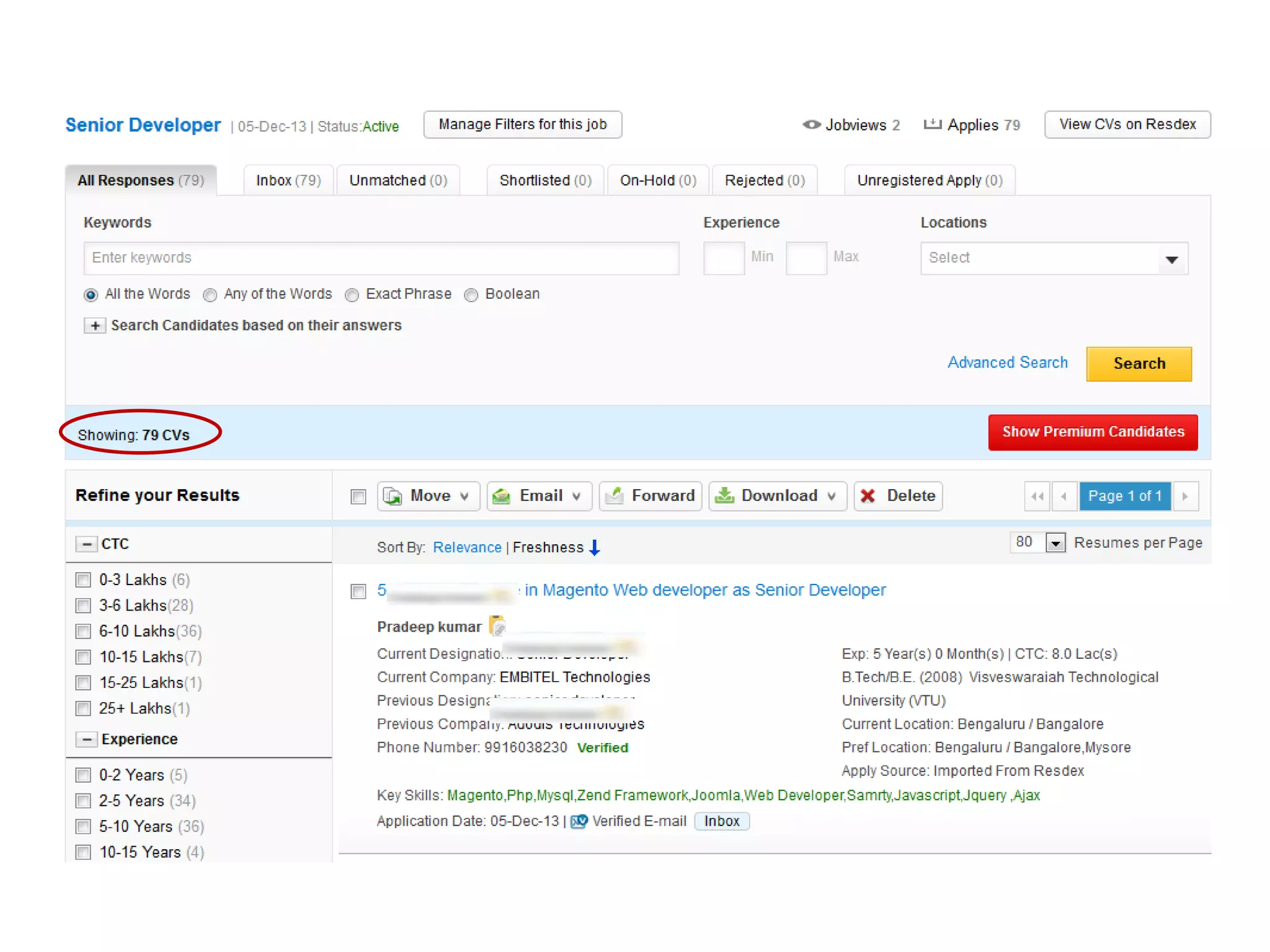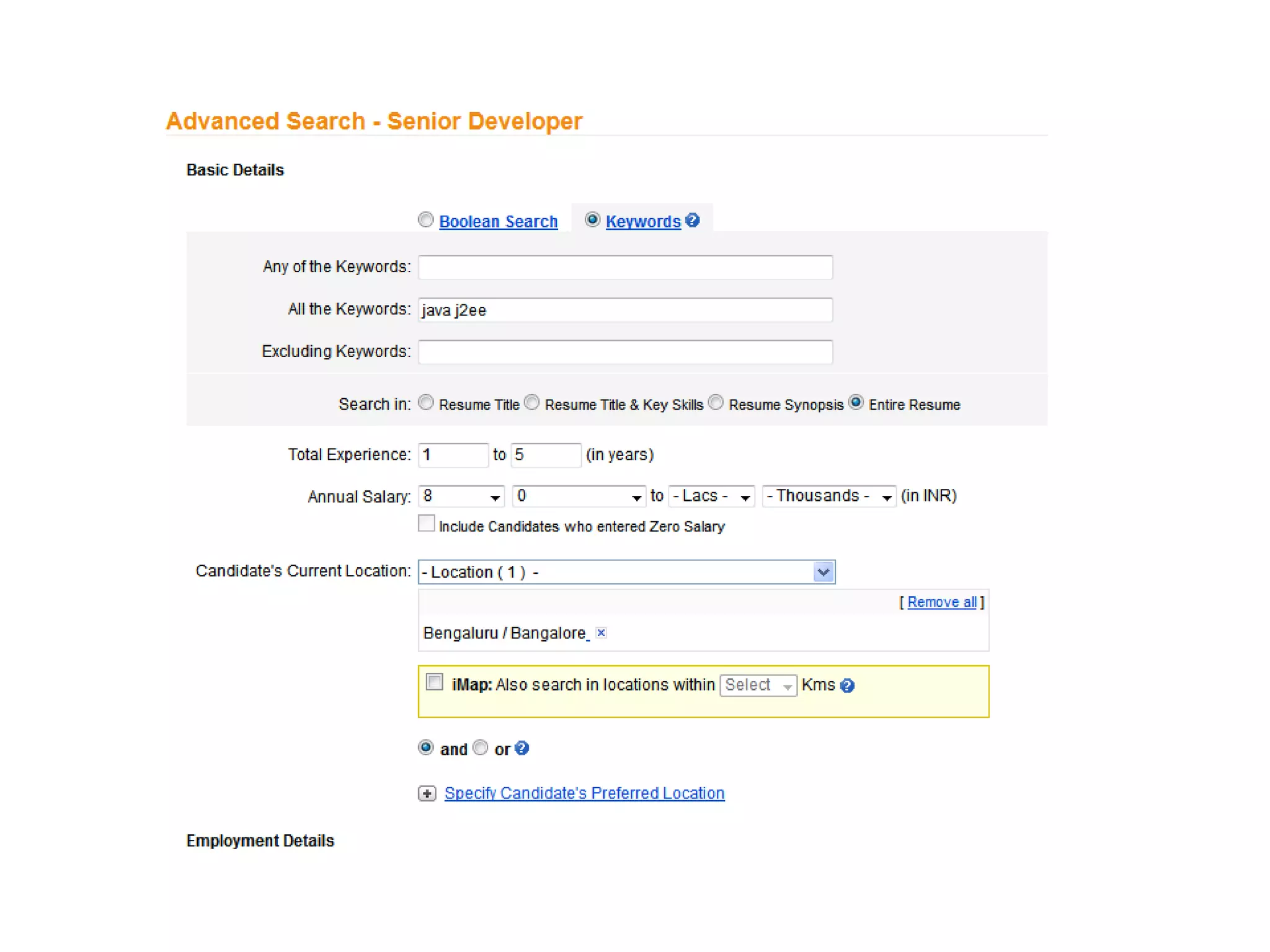 The document provides a guide on using the advanced search feature in eApps to find suitable candidates for job postings. It outlines steps to set search criteria such as keywords, experience, salary, and location, as well as additional filters based on functional area, industry, and education. It also mentions the option to search based on custom questions and specific folders, concluding with a contact email for further queries.